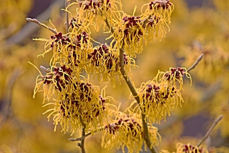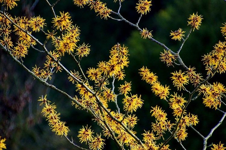 De toverhazelaar, Hamamelis is een echte eyecatcher en zijn werkelijk betoverend. Ze bloeien ongeacht koude of sneeuw met gele, oranje en rode bloemen op de kale takken en verspreiden een krachtig maar heerlijk zoete geur door de hele tuin.