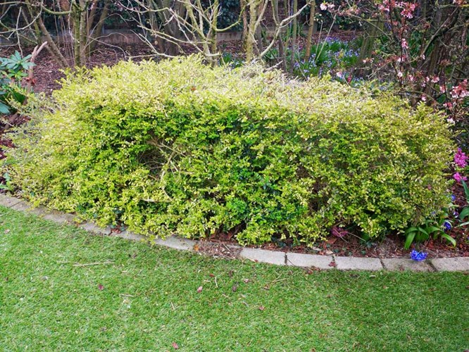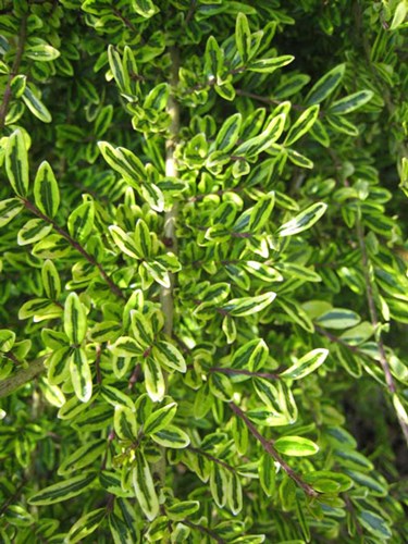 Heester. Winterhard, groenblijvend. Het is een dichtvertakte bossige compacte bladhoudende struik met overhangende takken die kan uitgroeien tot 1,5 m hoog. De blaadjes zijn donkergroen, langwerpig, bovenzijde donkergroen met onregelmatige groengele zoom ongeveer 1,3 x 0,5 cm.