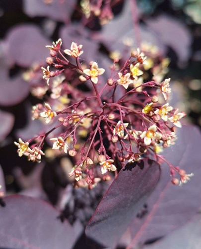 Opvallend zijn de ovaalvormige bladeren die in de lente violetrood verschijnen en naarmate de zomer vordert paarsrood worden. De pruikenboom bloeit rijkelijk met lilaroze geveerde bloempluimen en het geheel lijkt dan een beetje op een pruik van kleine bloemetjes, alhoewel de bloempjes op zichzelf niet opvallend zijn. Bloei: Juni.