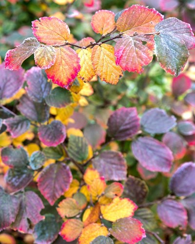Fothergilla 'Blue Shadow' is een plant met een schitterende verkleuring in het najaar. De bladeren verkleuren dan van het blauwgroene, de kleur die ze de rest van het jaar hebben, naar kleurrijke oranje, rode en gele tinten. In de lente, zo rond april en mei, komen de witte bloemen tevoorschijn die gevormd zijn uit crèmekleurige meeldraden.