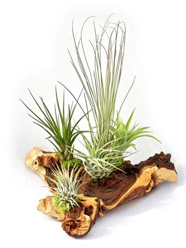 Zet de plantjes in een stuk ruwe schors, op een grillige tak of een brute steen voor een landelijke ‘boslook’. Plaats ze in een grote (oester)schelp, op een stuk wrakhout of een gladde kei (gebruik een druppeltje neutrale lijm) voor een maritiem effect. Of ga voor strak met een houten blokje, een glazen bal of een van de trendy kant-en-klare houdertjes van metaaldraad, glas, of een ander materiaal.