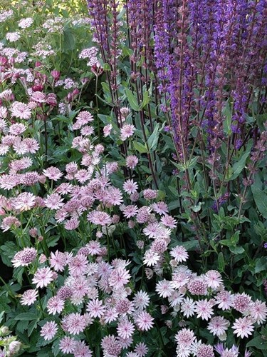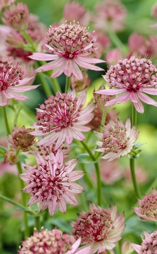 Astrantia major is de soort waaruit al onze cultivars stammen en deze rassen variëren van wit tot donkerrood, hoogte 50 tot 80cm.