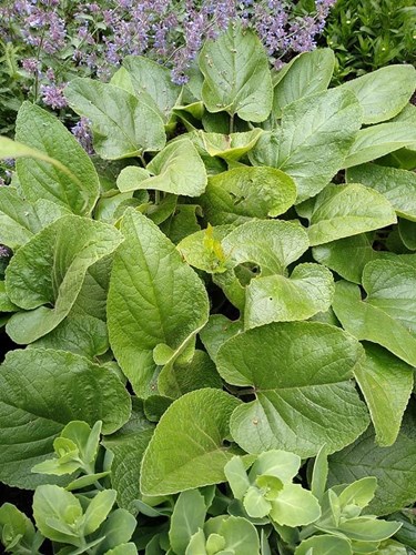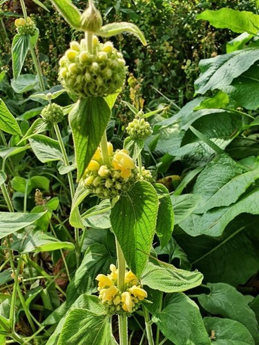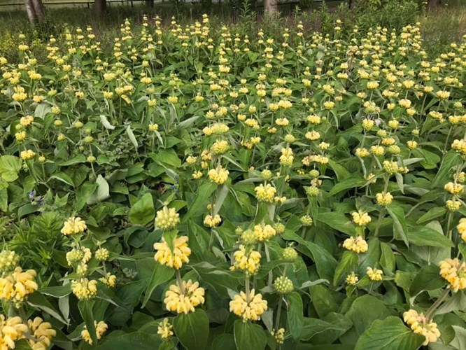 Onderbeplanting met decoratieve bloemen en zaaddozen.