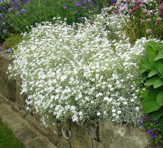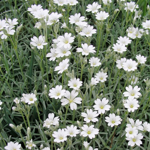 Nog compacter en daarom zeer aan te bevelen is ook de fraaie variëteit Cerastium tomentosum var. columnae.